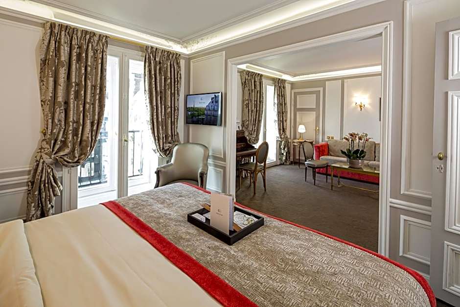 This suite features views of the Eiffel Tower, Louver Museum, Grand Palais glass roof and the Tuileries Gardens. Please state your preference for a double or twin bed configuration when booking, this is subject to availability. This room can accommodate a baby cot.